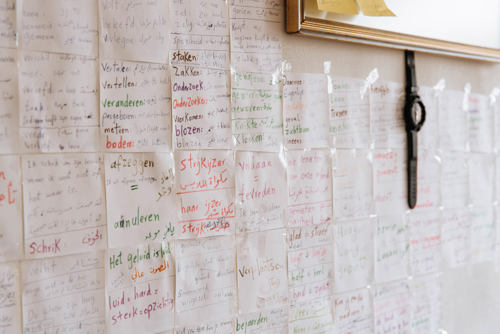 Wat mij opvalt in zijn huis is, dat het boven de eettafel bezaait is met allemaal briefjes met Nederlandse woorden, vertaald naar het Arabisch en het Engels. Ook ligt zijn eettafel vol met oefenbladen en bij de bank kinderboeken uit de bibliotheek. M. lacht “Zo leer ik Nederlands. Iedere week staat er voor de Action hier in de wijk een gepensioneerd docent Nederlands. Hij leert mij en nog wat anderen de taal.” M. hoopt dat wanneer hij nog beter Nederlands spreekt, hij zijn oude vak weer op kan pakken. En ik hoop het met hem mee.