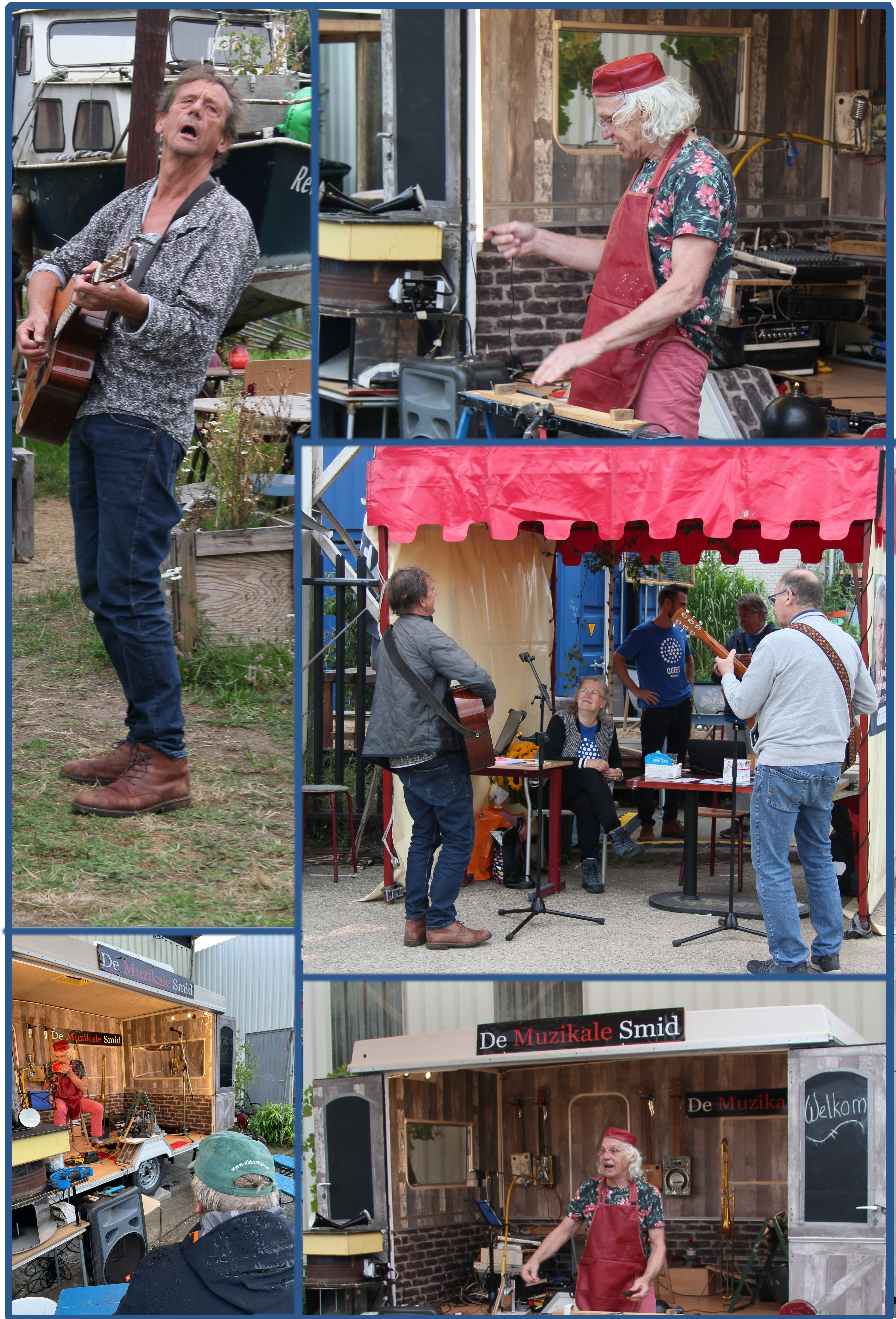Terwijl iedereen zich langzaam settelde, speelde Troubadour Henk gitaar. Relaxte, herkenbare muziek. Goede sfeer. Hij stopt voor het eerste optreden van de dag: Muzikale Smid Marius Broeders. Alsof hij er altijd staat. Zijn caravan, zijn straatnaambordje, zijn tribune: hij past prima in het decor van Hubert.